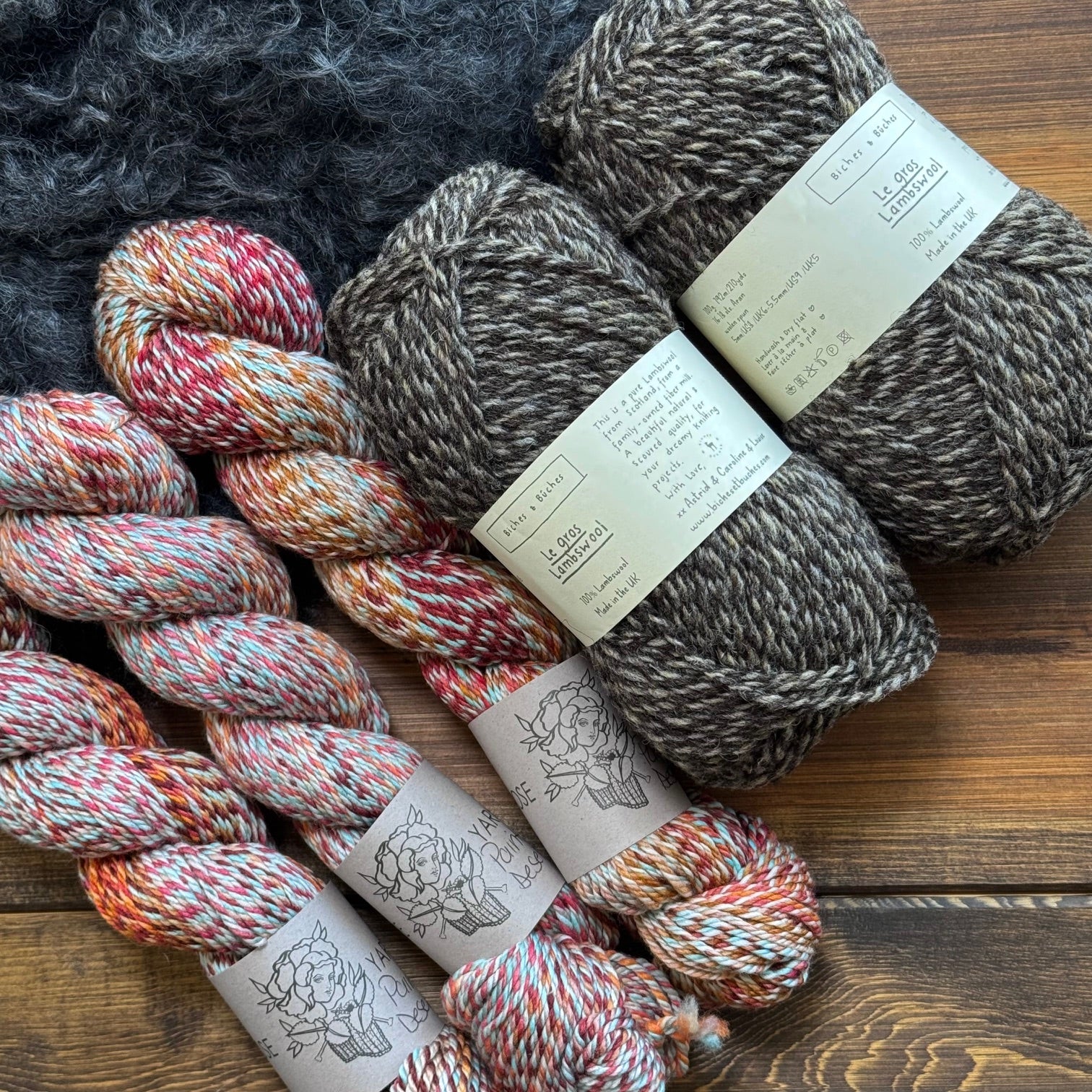 MC (Biches & Buches 'Le Gros Lambswool')- 2 skeins: Undyed Dark Brown and Grey